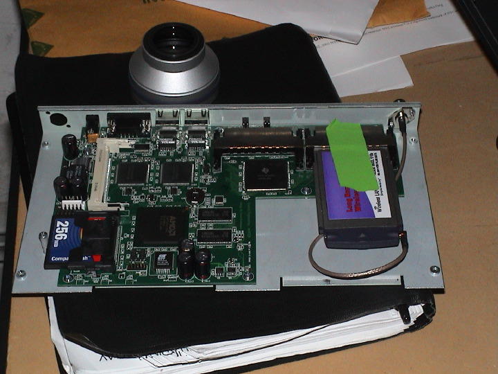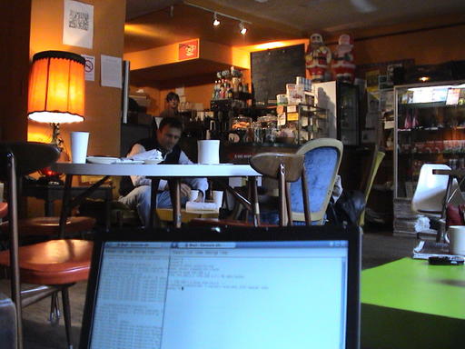 On Sunday I returned to Alt.Coffee to meet with Ahmi Wolf. He and Mark Argo are the creators of the Bass-Station, a turn-of-the-80s suitcase-size ghetto blaster that also happens to be a digital juke box and a Wi-Fi hot spot. Ahmi and Mark removed the radio and cassette components of this funky old thing and replaced them with a variety of modern portable Wi-Fi goods: Via mini-ITX motherboard, wireless interface card hooked to an antenna, Debian (Woody) loaded onto a CompactFlash card, and a 120GB hard drive. They left the amplifier and speakers and hooked them up to the board's audio output.
