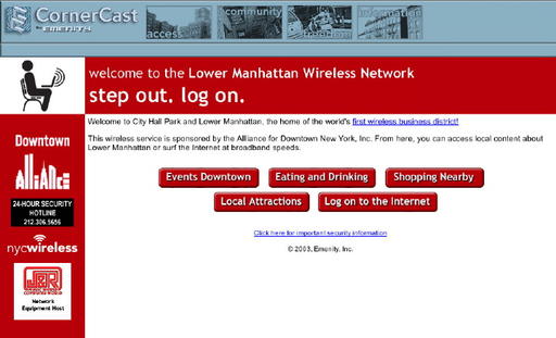 Although New York ranks 27th on Intel's list of “most unwired” cities (Portland is first), it is perhaps the best example of a working consensus between hackers, businesses, government and nonprofits about the need for free public Wi-Fi. This consensus is what gave rise to NYCwireless, a self-described “loose collection of interested minds”. NYCwireless has two missions: to provide free public wireless Internet access and to provide a forum for wireless technology development.