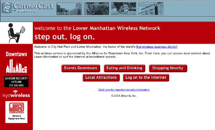 In May 2003, when the FCC continued deregulating ownership of what we used to call the “public” air waves, the agency made a big deal about “saving” what was left of “free over-the-air” broadcasting. The Internet, however, needs no deregulation—or regulation—to make it free over the air. All it needs is generous technologists, citizens and civic organizations. That's what we have in New York City today. And, their work is remarkable to behold.