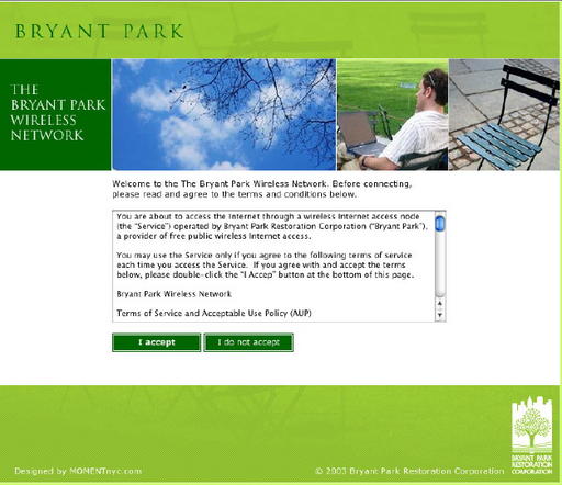 Emenity's biggest customer is the Downtown Alliance, a business improvement district (BID) organized to “create and promote a safe, clean, live-work, totally wired community”. BIDs throughout the city are supported by a small additional local sales tax. Improvements to Bryant Park—which are nothing less than spectacular, considering the no-mans-land it used to be—are examples of a BID at work. Because the alliance serves landowners, it also can approach them with requests to use their roofs or windows for wireless antennas aimed down at public spaces.