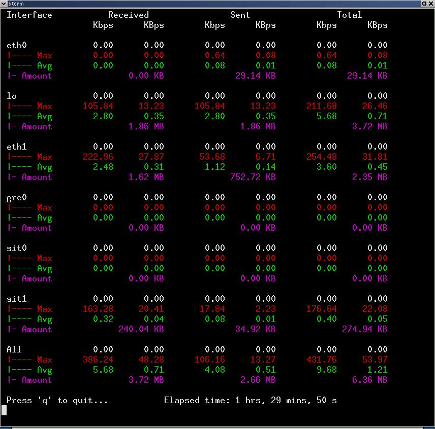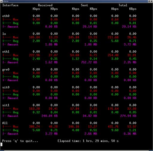 For those who like to watch traffic while it's passing, ibmonitor allows you to do this. It shows you maximum traffic, data throughput and average traffic as well as current traffic. Display is designed to fit on the standard VT, although that depends on what you have turned on and how many interfaces you have. Requires: Perl, Perl module Term::ReadKey, Getopt::Long, Term::ANSIColor and Data::Dumper.