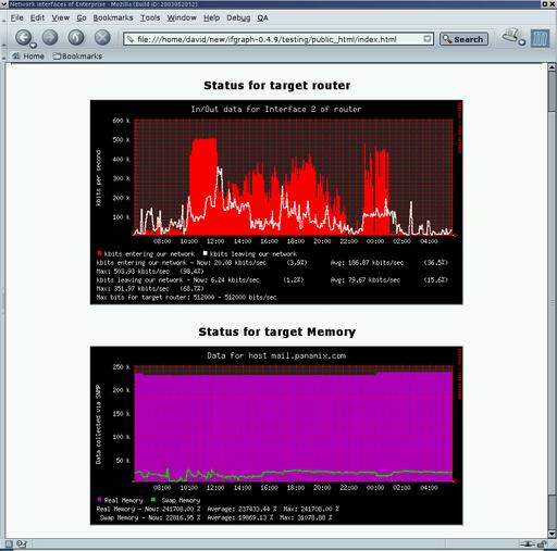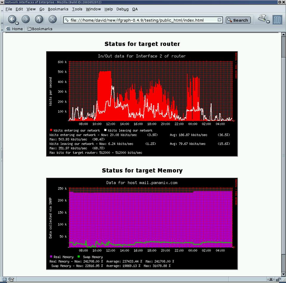 If you find, for whatever reason, that MRTG isn't the tool for you, but need something to show you the I/O on a router interface (or even a host interface, like your mail or Web host), check out ifGraph. By default, it creates graphs for interface statistics and memory usage but should be adaptable to most anything you can collect with SNMP. Requires: Perl, Perl modules FindBin, Getopt::Std, Net::SNMP, File::Copy and rrdtool.