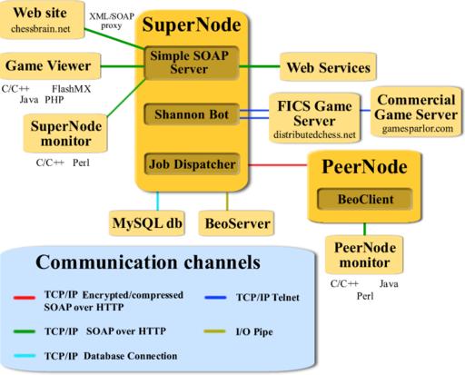 The SuperNode and PeerNode parse SOAP requests and route commands to an internal command dispatcher, which ensures that the correct command handlers process the requests. In the SuperNode, the most common requests come from PeerNode clients; a PeerNode must connect to request a job unit. A job unit is an XML block containing a game position and instructions on how to analyze the position. A PeerNode contains a complete chess engine component, compiled and linked as a static library. When the PeerNode receives a job unit, it processes the SOAP response, extracts the job-specific information and passes instructions to its internal chess component for analysis.