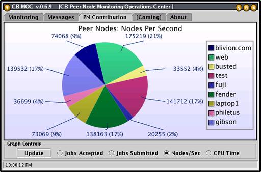 Because many members of the ChessBrain community run PeerNode clients on several machines, they wanted a convenient way to monitor the status of a group of machines. The PeerNode client was modified to post SOAP requests to port 3434 so PeerNode monitor applications could listen on that port and display real-time status information. I wrote the first PeerNode monitor application, and other members submitted their own. Greg Davis and Oliver Otte both submitted Perl-based PeerNode monitors. The most popular PeerNode monitor, CBMoc, was written in Java by Kris Drent.