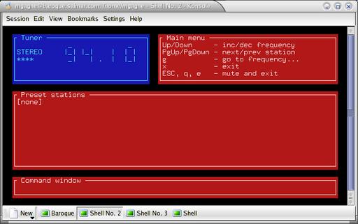 Watching television is obviously the point, but these TV tuner cards sometimes have FM radio receivers as well. Watching television while you are trying to work might qualify as distracting. Listening to the radio isn't as problematic. An FM radio program that caught my eye is Gerd Knorr's frightfully simple radio program (bytesex.org/xawtv). This is an ncurses-based program that comes as part of the xawtv source package. I make a point of specifying source here, because the package, called radio, is separate from xawtv when you work with RPMs.