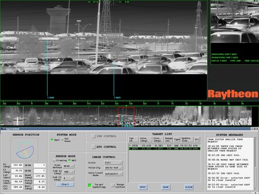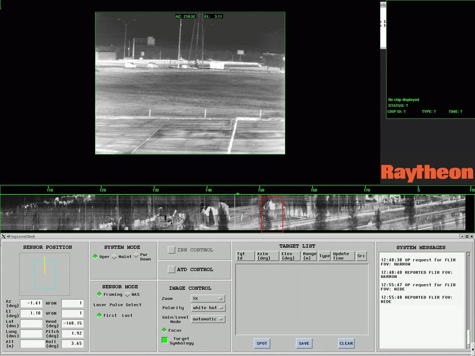 As mentioned above, the framing video is live image data. The image in the WAS window is a compressed image strip that represents an image taken by a rapid scan of the sensor across a fixed area. Symbology in the WAS strip includes locations where the targeting systems think there might be targets. The SFOV is a larger view of a user-selected section of the WAS strip that shows more detail. Target symbology and information from the digital map are visible here. Image chips are segments of the scene where the targeting system finds something interesting. These are presented to the operator for evaluation and reporting to other systems that are off-vehicle. Figure 3 shows an outdoor view with the system in framing mode with the GUI, framing video and WAS strip. Figure 4 shows the system in WAS mode with the WAS strip, SFOV, GUI and an image chip window.