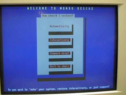 In addition to a total restore option, mondoarchive also provides another function. In the event that the data on the machine you cloned is static, you probably don't want that data to change. This is the case at Midwest Tool & Die with our Linux routers. Using mondoarchive, we have the ability to verify a software load against the backup and discover whether any changes have been made recently. This is easy. First, reboot the system with CD #1 in the CD-ROM drive. Then type # compare.