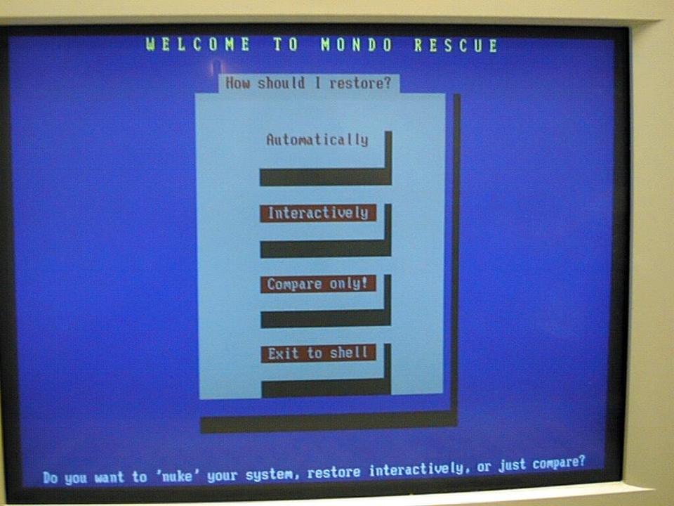 If you're using mondoarchive solely as an emergency restore utility, the only option you really need to worry about is nuke. After the CD boots, type nuke at the prompt and watch mondoarchive do its magic. After it is done restoring, your system comes back to the way it was before you ran mondoarchive. This can be handy in the event of a catastrophic server failure when you need to get back up quickly. It also can be helpful when you're building preproduction or test bed systems that you would like to roll back to a certain development point.