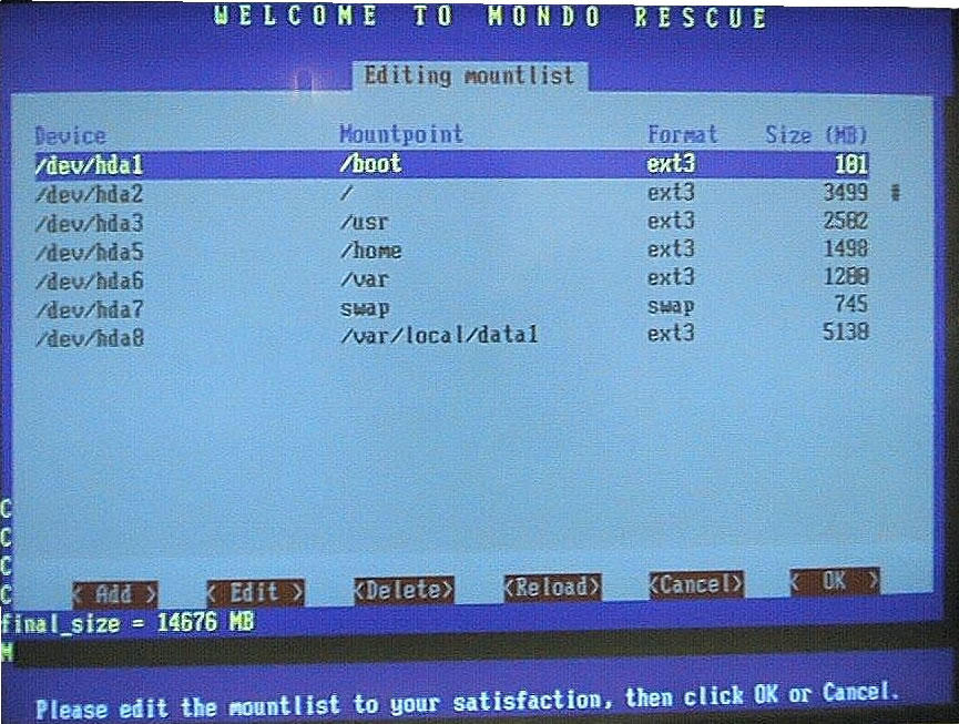 Mondo then opens up /etc/fstab and lilo.conf/grub.conf for editing in vi. You should make changes accordingly so they match your new mountlist: