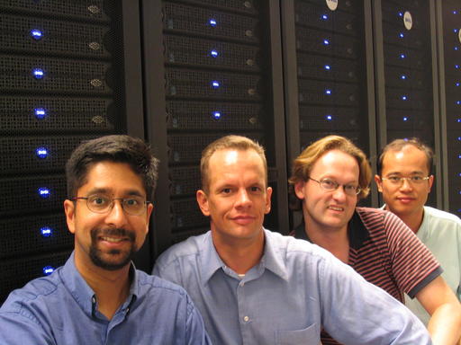 Figure 3. Iceberg in its new home. From left to right: Vijay Pande, principal investigator for Folding@home; Steve Jones, Iceberg architect; Erik Lindahl, postdoc; and Young Min Rhee, research scientist.