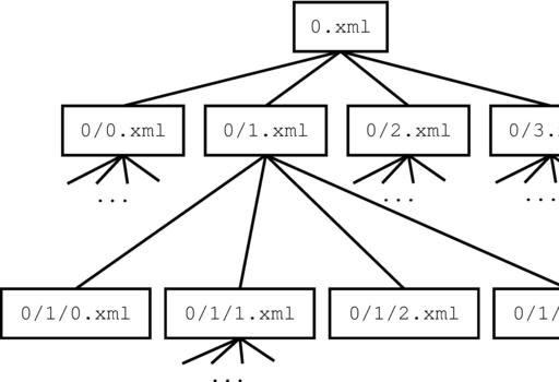 Re-examining indexing methods based on these constraints yielded an interesting solution: B-trees and hashes are the two most commonly used indexing methods. I chose to use B-trees due to the fact that a filesystem organizes files in a tree; this could be used to store the structure of the B-tree, saving some precious space in the process. Second, the key/link pairs could be analyzed, and a balanced B-tree could be created. The structure of the XML files themselves was kept as minimal as possible, so single-letter tags were used as a space-saving move.