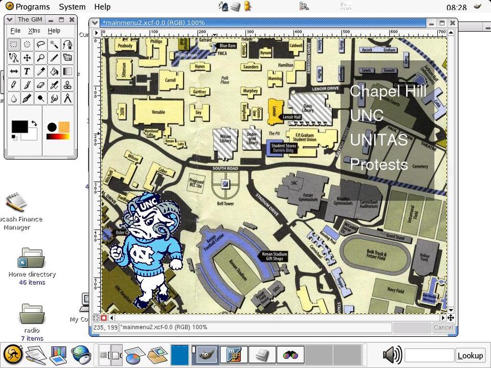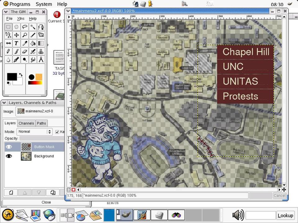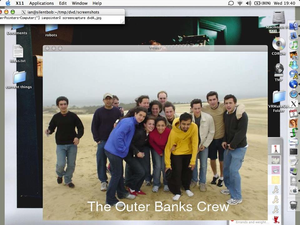 The DVD application I'm creating is a photo album, using pictures that I took while studying abroad at UNC-Chapel Hill this past year. For simplicity's sake, I have only six photos in each category. On paper, I decide that the main menu (the VMGM unit) should have five buttons, four of which are simple text buttons (one for each different photo category), plus a secret link unlocking extra pictures (secret extra features are a common occurrence in commercial DVDs) and a music track playing in the background. The four regular buttons link to one of four menus, one for each different section. The menu system for each section consists of two menus and an audio track, with selectable preview images of the slideshow, a button to move onto the next set of preview images and two buttons that allow the viewer to watch the complete slideshow or go back to the main menu. To keep things simple, the photo slideshow should have the same song as the section menu playing in the background. After the slideshow is finished, the viewer is sent back to the section menu. The secret link is a short slideshow with no menu, but it has two different music tracks that the viewer can switch between while the video sequence is playing.