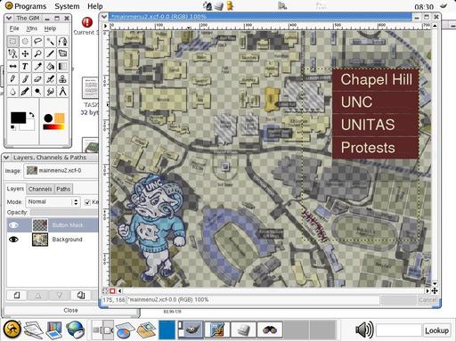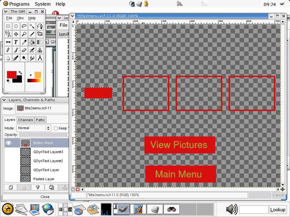 The process for creating DVD menus is similar to generating the slides. Using The GIMP, make a new image of size 720×576 (for PAL), with a resolution of 75dpi in the x-axis and 80 in the y-axis (NTSC values are 81 and 72). Add an alpha channel, then create the menu picture you desire (see Figure 1 for the base image of the main menu). Once this is finished, add another layer and mark out the location of the buttons that can be highlighted, as seen in Figure 2. A maximum of four colors can be used for this mask; I used red to mark the button areas, and white to make sure that the text still was visible when a button was selected. When you're satisfied with the menu, export the background layer as a JPEG file and the mask as an indexed PNG. Make sure you've set the number of colors to four, three if you're saving the transparent background as a color. This process is repeated for all menus required in the DVD (see Figures 3 and 4 for a further example).