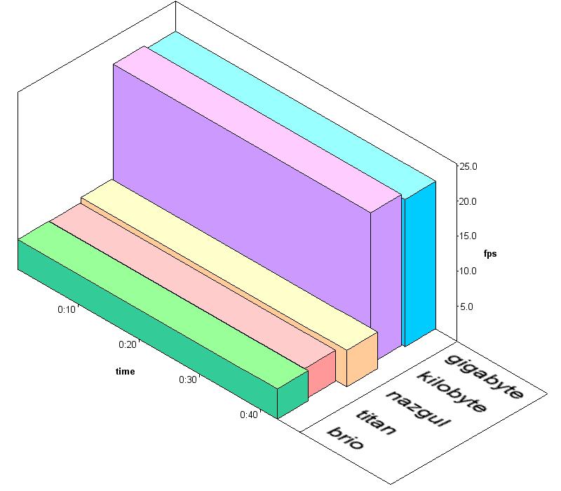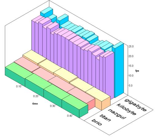 We used the two load balancing strategies, Small-Chunks and Master-Worker. The testing movie was All about My Mother, which has a length of 1 hour and 37 minutes and an original size of 2.94GB. The tuples in the comp column in Table 2 are the first letters of the names of the test bed computers, for example, g refers to gigabyte and t refers to titan. A - symbol indicates that the computer was not used in that particular test. Chunk size in Small-Chunks was set to 60MB. Video preprocessing time has not been included because it was negligible in all cases.