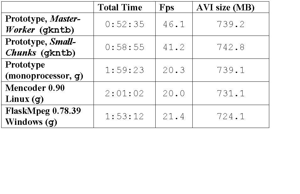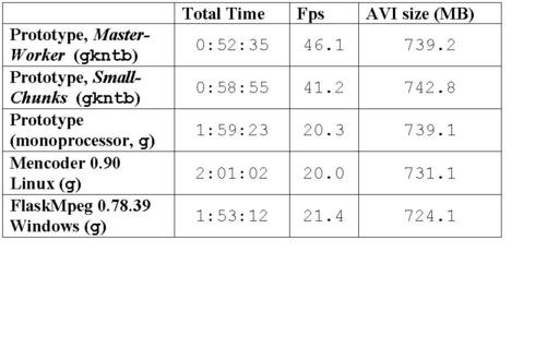 In order to evaluate further the behavior of the prototype, we compared it with two popular transcoding tools, Mencoder and FlaskMpeg. Table 3 shows these results. The speed of the monoprocessor version of our prototype lies between FlaskMpeg's and Mencoder's. Regarding output size, in the worst case (Small-Chunks), our prototype delivers a DivX movie that is only 2.6% larger than FlaskMpeg's output. Indeed, the global compression rates achieved by Small-Chunks (24.67%) and FlaskMpeg (24.05%) are similar, and the difference is not relevant if processing speedup is taken into consideration. It is important to note that FlaskMpeg uses DivX codec v. 5.0.5 Pro, which was not available for Linux at the time this article was written. Therefore, compression performances may be even closer when the Linux version becomes available.