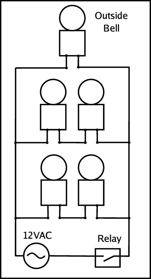 With the requirements defined I began to formulate a plan. Five new 12VAC bells and a 12VAC power supply were purchased. These are the same type of bells commonly used in alarm systems or any sounding system. The bells physically hammer themselves in the same manner as an old alarm clock, and they pump out the decibels. The bells needed to be wired so that connecting two wires would ring all the bells in the plant.