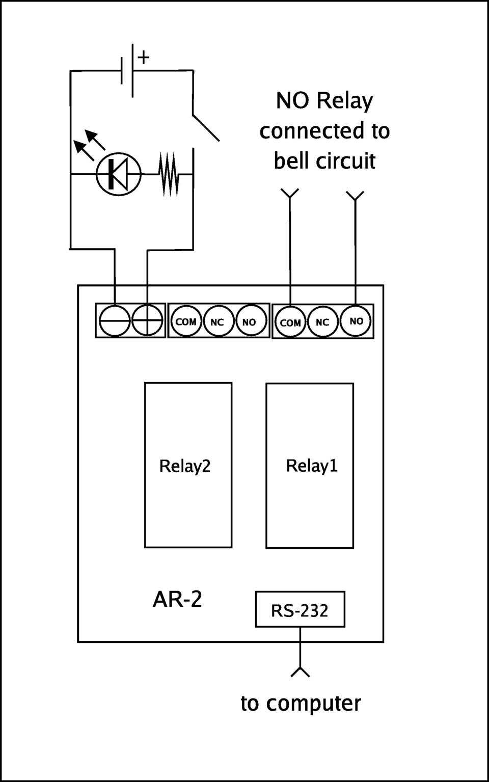 To control the bells, we needed to close the bells' circuit temporarily. I was pointed toward a specific relay device, the AR-2, that can be controlled by a computer over a serial port. This device would be used to complete the bell circuit, causing them to ring. The AR-2 is sold by Electronic Energy Control, Inc. (EECI) for about $44 US. It has two relays on a circuit board, and both can be connected as normally open (NO) or normally closed (NC) relays. Only one relay wired as NO would be used for this project. An enclosure (EN-B) to house the board also was purchased. An emergency on/off switch was mounted on the enclosure for use in case something went terribly wrong. The AR-2 is documented well enough that I knew it would be possible to write a program in C to control it. This program could be scheduled using cron jobs.
