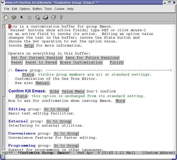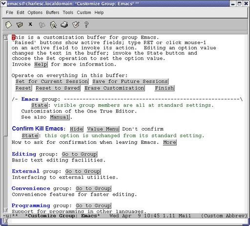 Like most GUI front ends, Customize is not as powerful as hacking the text configuration file, but it is easier to use. Fire up the Customization group, and you notice that Emacs builds the menus on the fly. That way it's always up to date (Figure 1).