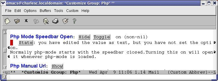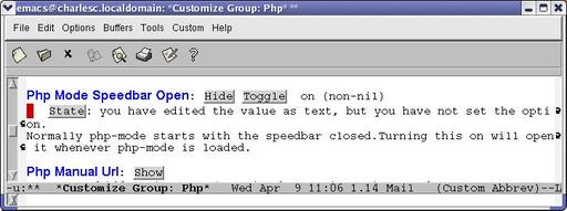 I'd like to turn on the PHP speedbar whenever I enter PHP mode, for example, when I visit a PHP file. To do this, I follow the menu tree to PHP mode customization (Figure 2). As you can see, I've toggled the state but haven't yet saved my changes. I can set it only for this session, or I can save the change for future sessions. When I do the latter, Emacs edits my .emacs file. You can verify the change by searching for the variable name in .emacs.