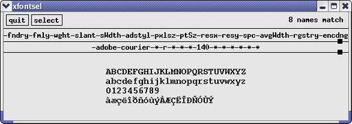 This definition is also where you set your font, if you don't like the default. The program xfontsel comes with XFree86, and you can use it to find a suitable font (Figure 3). Press Select as an option, and xfontsel puts it into the clipboard. Add another pair of parentheses to the definition of initial-frame-alist, insert the phrase font . and insert a pair of quote marks. Then recover the font definition between the quotes with Ctrl-Y, like any other clipboard entry: