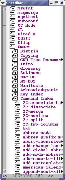 I explained how to automate turning on the speedbar in the discussion of the Customize Emacs system. Speedbar is a separate frame (window) that allows mouse-click navigation among Emacs buffers. As you can see from the illustration, the speedbar allows for tree structures, like Emacs' Info system. Click on the + to open subnodes, and click on the – to close them (Figure 4).