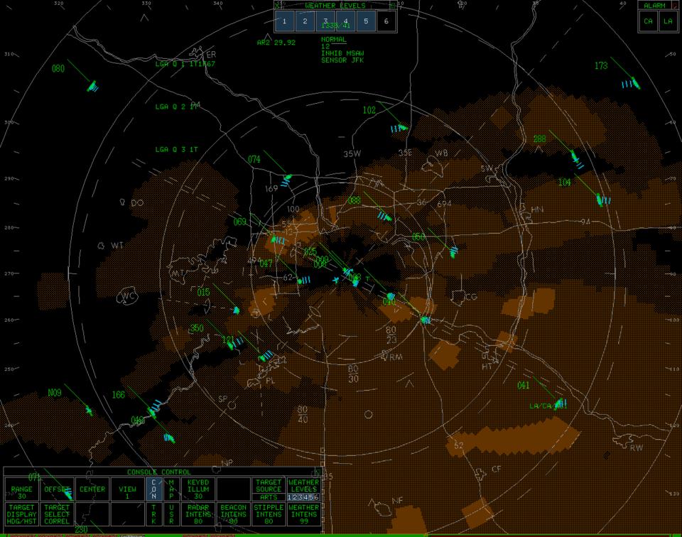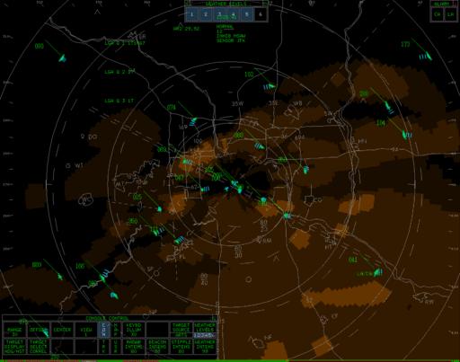 Once I had all the messaging code compiled and running, I needed an application. The FAA agreed to fund the further development of the TP, CP, SMC and DPS systems for desktop testing and debugging. The systems all ported well, but the DPS had some issues with X displaying. Normally the large 2048×2048 pixel display is run on special hardware with two or three pseudo-color physical planes. If the maps and menus are drawn on the bottom plane, the weather on another plane and the aircraft on the top plane, the whole display doesn't need to be redrawn if an aircraft moves. To make this plane idea work, the color map was split into three parts. Being pseudo-color (8-bit) limited the number of colors in each plane. The map and menu plane got one color (white), the weather got another color (brown) and the primary display plane got 78 colors.