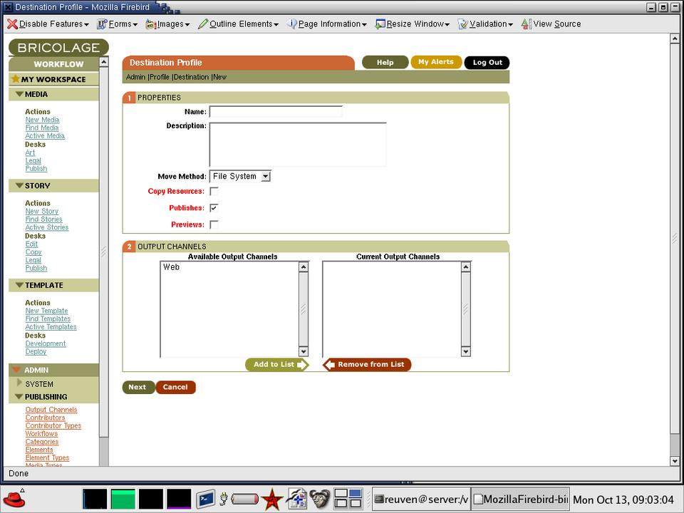 Although Bricolage allows you to define new output channels, keep the default Web channel for now. The difference between output channels and destinations can be a bit confusing at first. Think of an output channel as a logical target and a destination as a physical target, and then realize that you can mix and match them in all sorts of different ways. You can have multiple output channels going to a single destination or a single output channel going to multiple destinations.