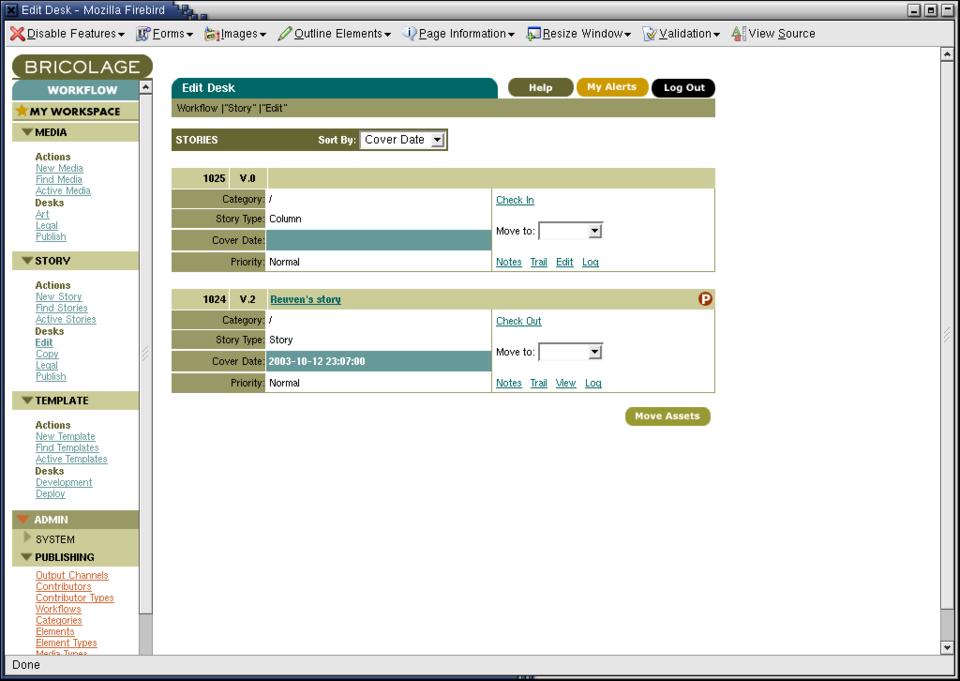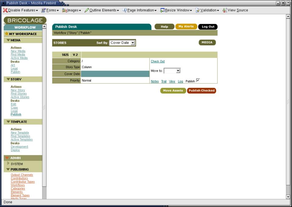 We then can go to the Publish Desk, where items are reviewed one final time before they are published to the Web. Notice that Bricolage comes with built-in support for copyediting and legal reviews. You can create new desks as well, if your organizational structure is more complicated than the default setup.