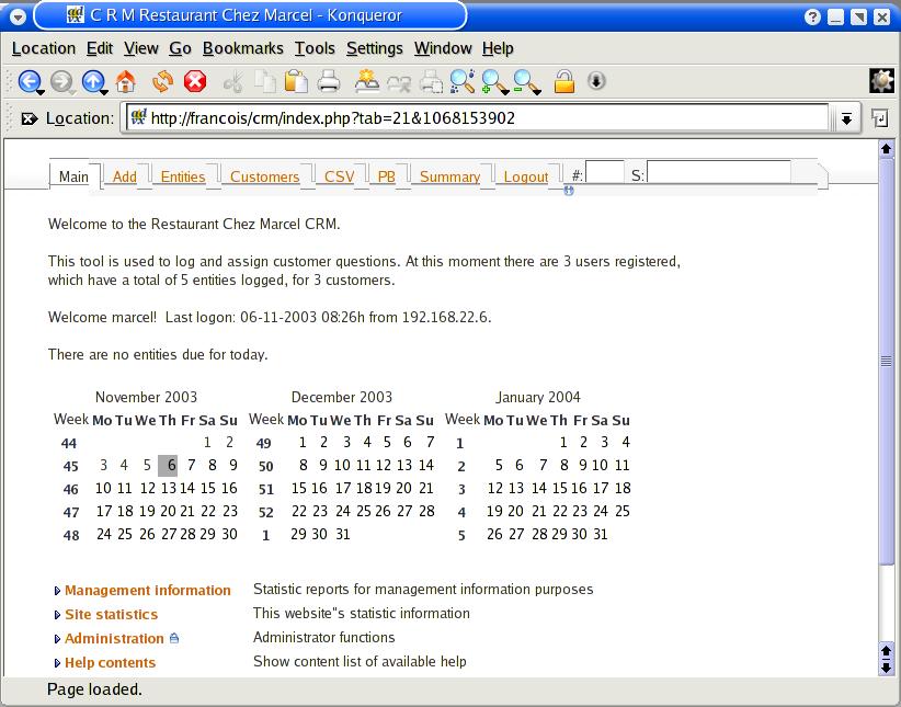 A system like this isn't particularly useful without customer information, so start adding. Click the Customers tab, then click Add a customer on the screen that follows. Repeat this for all of your customers. Once you have customer data entered, you can create Entities against those customers. An entity is anything you have to do for that customer, whether it is a pending order, an open trouble ticket, a friendly follow-up call or a note to send flowers on someone's birthday. CRM-ctt even can send you an e-mail to remind you of those things. As you explore CRM-ctt, you'll find great reporting features, including a one-click export to PDF option for quick, professional reports.