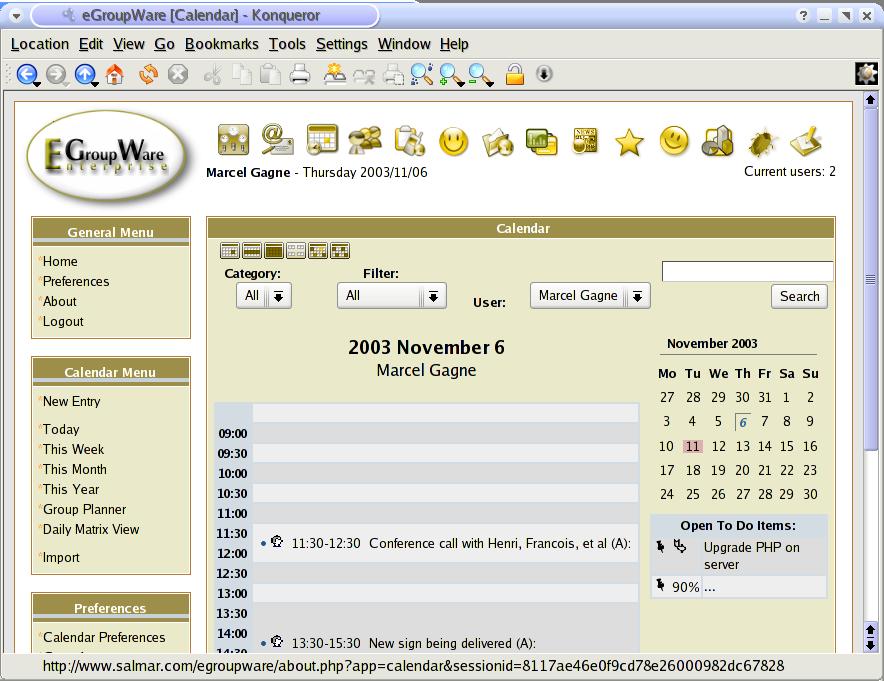 Figure 3. eGroupWare offers a calendar, trouble ticket system and management for user Web sites.