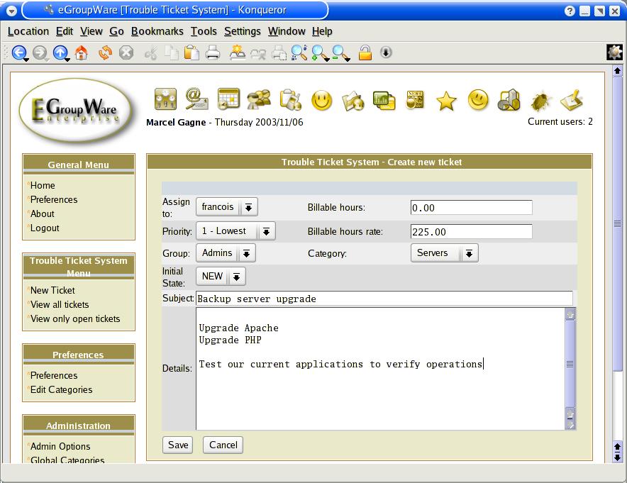 Figure 4. Entering a Trouble Ticket in eGroupWare