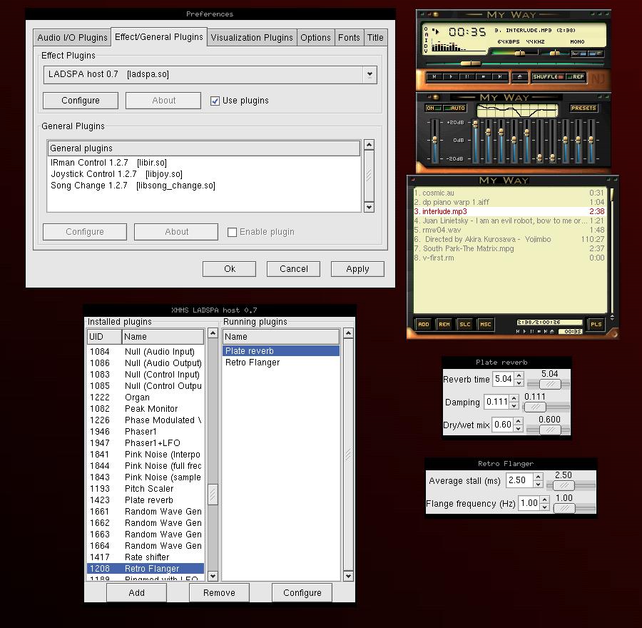 Erik de Castro Lopo's libsndfile has taken its place as the preferred sound file I/O library for such projects as the Ardour digital audio workstation and the MusE audio/MIDI sequencer. Erik's libxmms_sndfile plugin expands XMMS' sound file support to a wider variety of sound file types, including AIFF, AU/SND, IRCAM SF and many others. Nandan Dixit's libxmmsmplayer plugin adds the ability to play any video file format supported by the MPlayer video playback engine, extending XMMS' file support to MPEG, ASF, AVI, MOV and other video formats. Nick Lamb's ladspa.so is in fact a plugin to host plugins. LADSPA (the Linux Audio Developers Simple Plugin API) is an interface designed for creating simple but powerful audio processing plugins. Ladspa.so brings dozens of interesting effects to XMMS, all usable during real-time playback. Figure 1 shows off XMMS with a playlist containing sound files in five formats (AIFF, AU, MP3, OGG and WAV); movies in MPEG, AVI and RM formats (yes, the MPlayer plugin handles RealVideo too); and the LADSPA plugin at work lending its plate reverb and retro flanger to the XMMS audio processing functions.