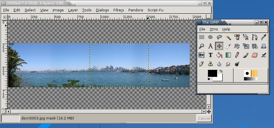 The Nikon Coolpix 4300, like most digital cameras, comes with software on CD to perform rudimentary photo-stitching. Unfortunately, the software is not for Linux. Using Google, it was hard to find anything that would do the job under Linux, until I remembered The GIMP. There are two ways to use The GIMP to create a panoramic photo, easy and hard. The hard way is to set up layers out of the different photos, edit filter and layer masks, mess about with transparency and layer them together, manually.