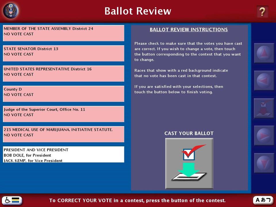 AccuPoll released its new multilingual electronic voting system, which combines the transparency of touchscreen input with the documentation of a voter-verified, printed paper record. The voting station guides voters through the voting process, and votes are confirmed with an on-screen acknowledgement and a paper Proof of Vote printed by the voting station. Once the vote is cast, the AccuPoll system provides an independent, voter-verified audit trail that is recorded simultaneously in multiple locations in both paper and electronic formats. The AccuPoll system meets the requirements of the Help America Vote Act of 2002, as well as accessibility requirements for disabled voters. AccuPoll runs on nonproprietary hardware and open-source software.