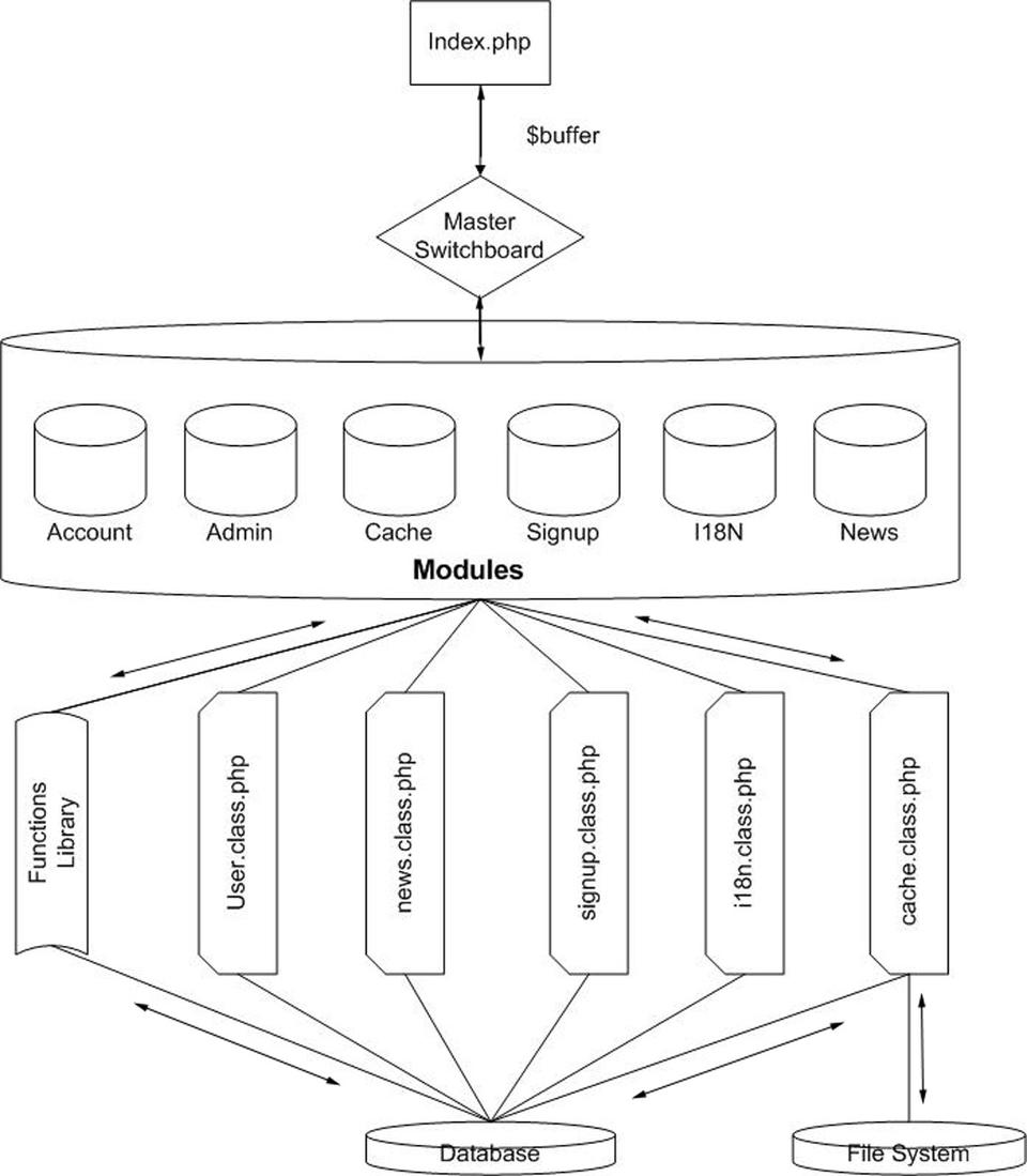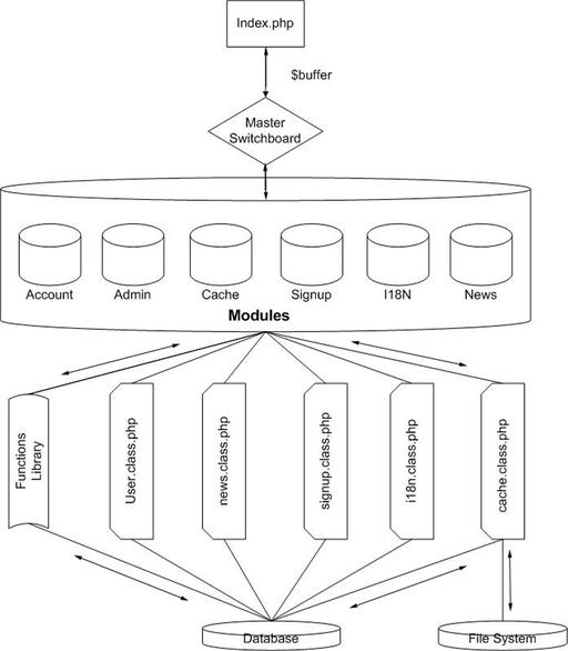 The data flow in this particular model may seem a little confusing at first, but it really is simple. User input is passed quickly to the appropriate module, and error control is implemented on the switchboard level. Other types of inputs are database access and filesystem access, and they are filtered by their appropriate classes. Every class extends a special skeleton class that provides the input filtering facility, so none of the classes have to worry about this.