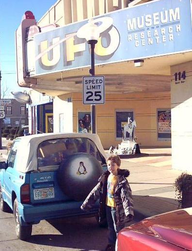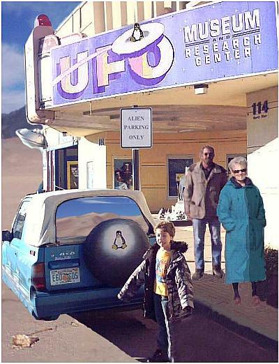 Here are a couple of photos of our last vacation. We went to Roswell, New Mexico to find out if the aliens were using Linux. Most were Debian supporters. There is a before and after photo. Some help from The GIMP was required.