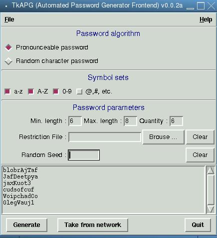 Using APG, you can get barely pronounceable passwords or totally random passwords. It has a server-client mode so you can request passwords over the network or generate them locally. An optional Tcl/Tk client makes it easy for anyone to use. APG is flexible and also includes a PHP application for your Web server to generate random passwords. Requires: libm, libcrypt, glibc and optionally Tcl/Tk.