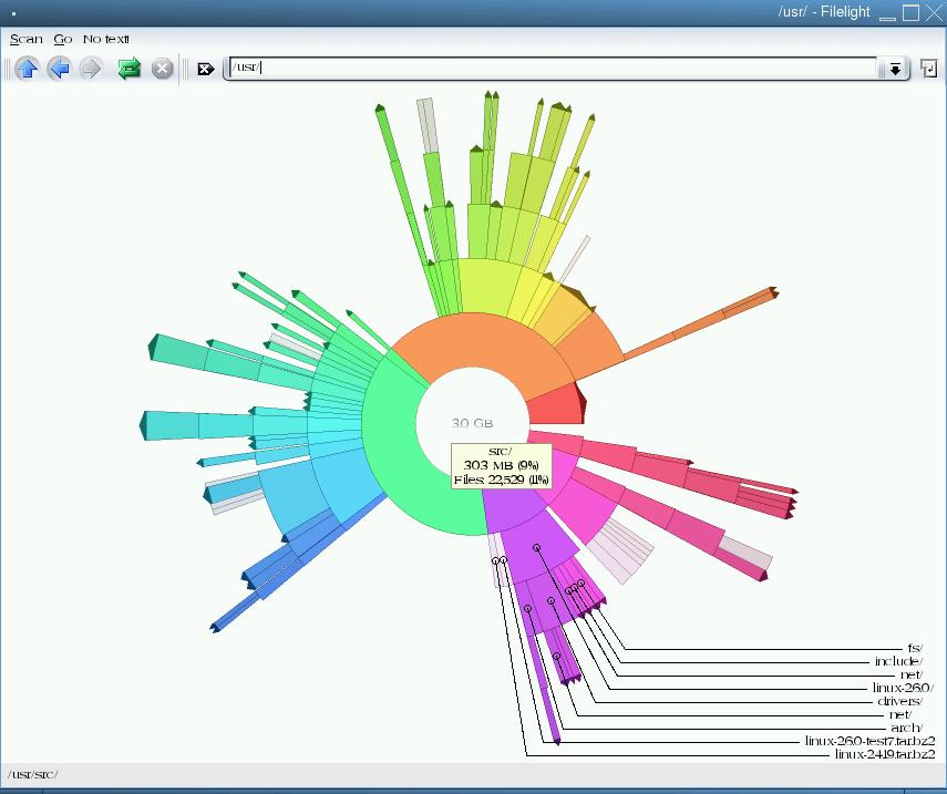 Filelight is a graphical version of the disk usage utility du. It shows you disk usage as a colored wheel. You can see the overall usage in the center of the circle, then various directories and subdirectories branching out. Moving your cursor over any area provides more detail on that area and subordinate areas. See at a glance where your disk space went. Requires: libkio, libkdesu, libutil, libfam, libkdeui, libkdecore, libDCOP, libresolv, libart_lgpl_2, libkdefx, libqt-mt, libaudio, libXt, libXmu, libXrender, libXcursor, libXft, libfreetype, libfontconfig, libdl, libpng12, libz, libXext, libX11, libSM, libICE, libpthread, libstdc++, libm, libgcc_s, glibc, libGL and libexpat.