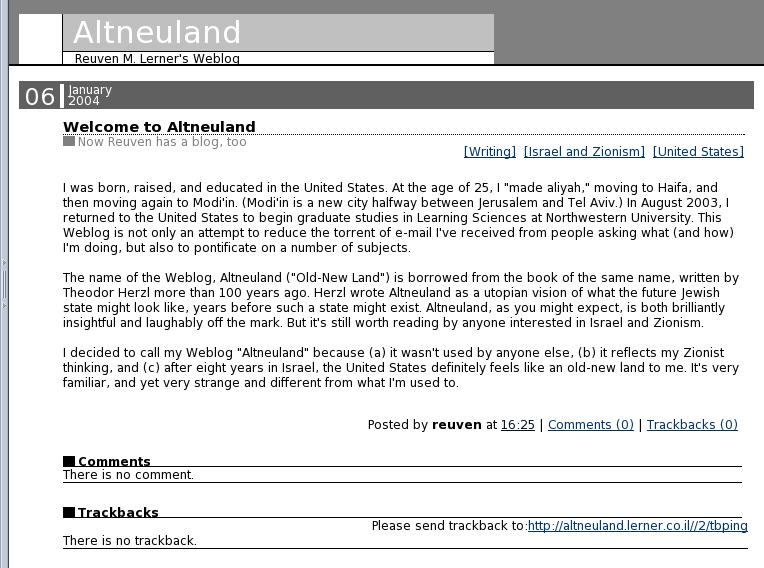 Moreover, some of the nicer Weblog features, such as comments and trackback, can be tricky to implement. They aren't necessarily hard to work with, per se, but given that it seems 100,000 different mechanisms for commenting on Weblog postings already are out there, I would like to avoid creating number 100,001.