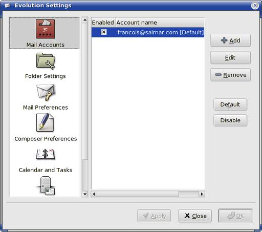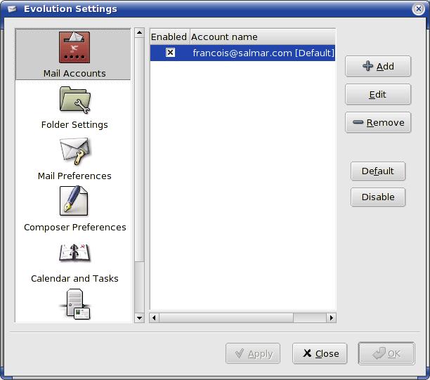 With Evolution open, click on your inbox. Now, click Tools on the menubar and select Settings. You now are looking at the Evolution Settings window (Figure 5). If the Mail Accounts icon in the left-hand sidebar isn't selected, click to select it now. Most people have one main account. If you have more than one, select the one you want to use with encryption and click the Edit button to the right. The Account dialog appears with several tabs along the top. The one you are interested in is labeled Security. Look for a field labeled PGP/GPG Key ID and enter your key ID there. Click OK to close that dialog, then OK again to get out of the Evolution Settings window.