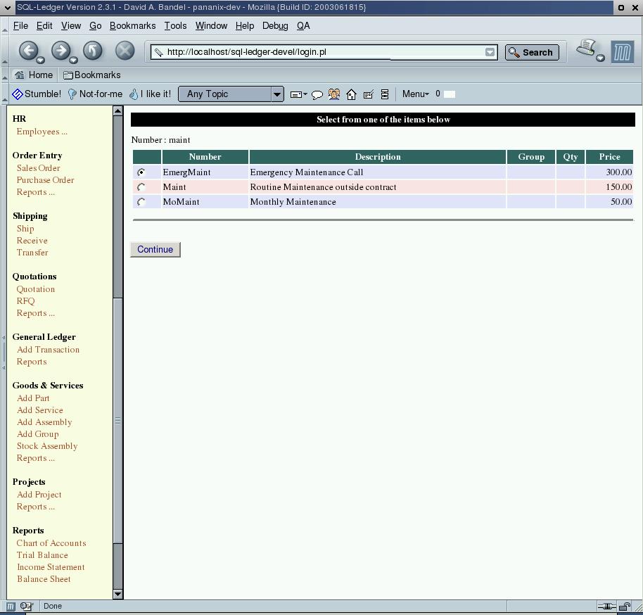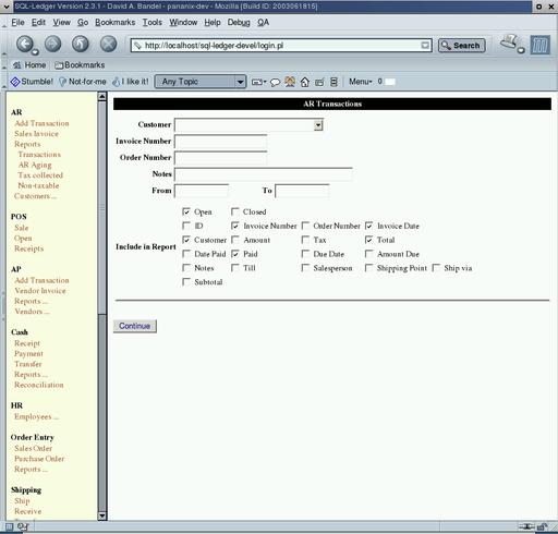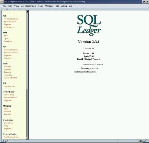 The major headings that show up depend on the user's configuration from the admin page. Entire menu headings can be removed or only specific items. So any given user's menubar may look a bit sparser than that shown in the screen captures, depending on setup and version in use. The screenshot in Figure 1 clearly shows this is Version 2.3.1, a development version. It is slightly more feature-rich than the stable version, but its designation as unstable warns you it hasn't been as thoroughly tested as the stable version. Major menu headings include AR, POS, AP, Cash, HR, Order Entry, Shipping, Quotations, General Ledger, Goods & Services, Projects and Reports.