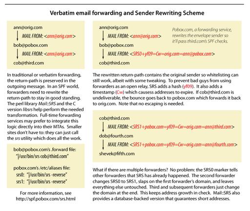 The solution is called SRS, sender rewriting scheme. It encapsulates the original sender address in the rewritten, SPF-compliant, return address. If a message should bounce, it comes back to you, and you unwrap the address and forward the bounce back to the sender. Forwarding services would have to do this even in a world without SPF, because ISPs already are performing pseudo-SPF checks. SPF simply gave everyone a standard way to do what they already were doing piecemeal. In the same way that responsible sites closed down their open relays over the past few years, in the coming months responsible sites will begin to operate SRS-compliant forwarding; pobox.com already is doing SRS, and other forwarding services are expected to follow.