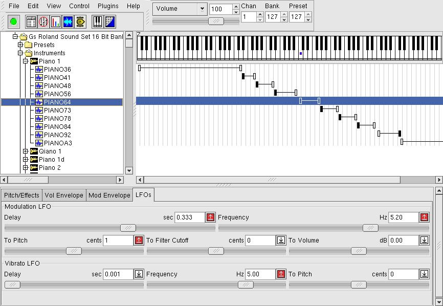 If you want to work with soundfonts, you definitely want Josh Green's excellent Swami in your toolkit. Swami is a soundfont-only editor with a well-designed GUI and a wealth of useful features. You can edit existing soundfonts and create your own from the level of individual samples up to the composite instrument. You also can edit and design your own soundfont banks. Other tools are available for setting an instrument's velocity response curves, keyboard zoning (mapping) and modulator routing. Because of Swami's strict focus, I don't have much more to say about it; it is first-rate and is highly recommended Linux audio software.