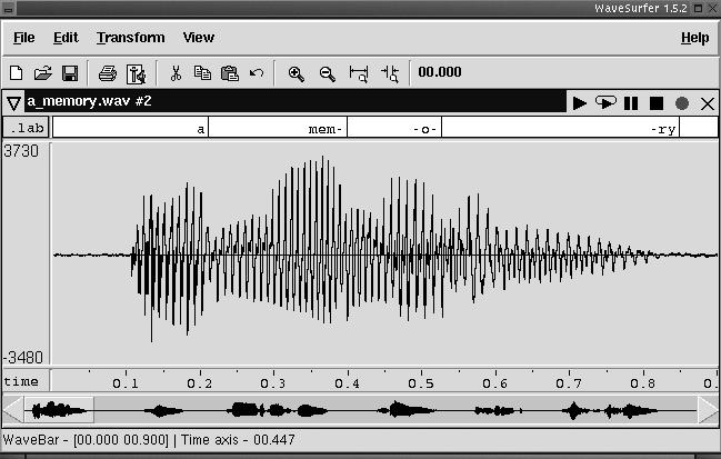 Figure 11 illustrates a simple use of WaveSurfer in speech analysis and representation. The main panel displays the region highlighted in the complete waveform, and the label display indicates the sound's phonemes. The label track is only one example of WaveSurfer's speech-oriented amenities. Others include spectrographic displays, pitch curve extraction and support for a variety of soundfile and transcription formats.