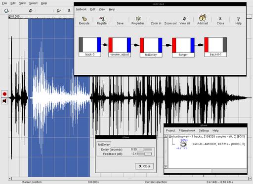 Figure 12 illustrates a simple example. The selection in the waveform display has been processed by a filternetwork composed of a gain control, a LADSPA delay plugin and a flanger. The track modules are included as the default I/O ports, representing the original input and the processed audio output.