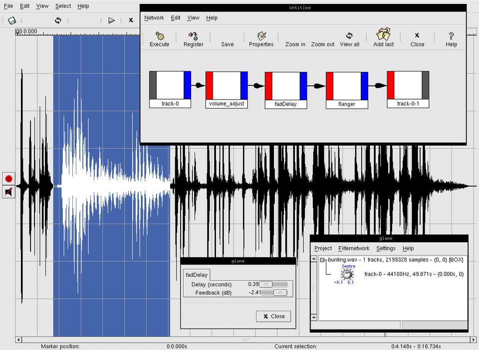 GLAME's developers have implemented an unusual design philosophy in their editor. GLAME (GNU/Linux Audio MEchanics) supplies the expected palette of tools for audio editing, but it also includes a powerful synthesis and processing environment called the filternetwork. A filternetwork provides a canvas on which icons representing synthesis primitives are patched together to create a processing or synthesis chain. Current primitives include oscillators, envelope generators, filters, I/O modules and LADSPA plugins. Once a synthesis network has been designed, it can be run to produce real-time audio or output to a file for further processing (in GLAME, of course). Right-clicking on the waveform display pops up a menu that includes the Apply Custom item. By selecting this item, you can apply your filternetwork to the active soundfile, suggesting some interesting processing possibilities.