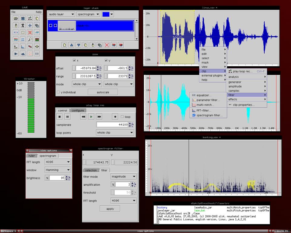 LAoE receives extra points for originality by providing direct editing in its spectral display. A user-defined brush is used to paint over areas for FFT filtering, and the filter itself can be adjusted for finer resolution. Most of this article's editors offer spectral displays, but only LAoE permits direct spectral editing.