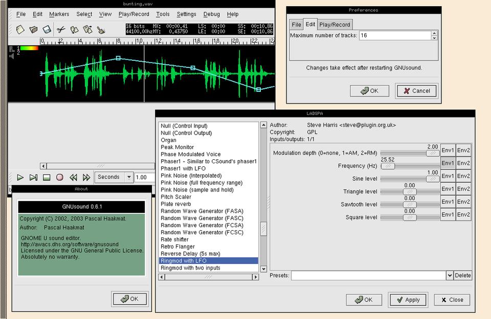 Although GNUsound is intended for use in the GNOME environment, I had no trouble building it under a Planet CCRMA Red Hat 9.0 system and using it in the BlackBox window manager.