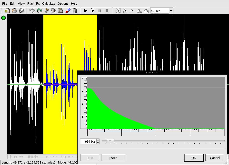 So which one is right for you? It's hard to say. I'm partial to Snd for its vast programmability and to ReZound for its GUI and organization, but you have to try some and see which fit your needs best. Above all, don't be intimidated by the apparent complexity of some of these editors. Approach them as you would The GIMP, testing their features at random until you have a sense of what they can do—don't be shy about clicking on the Undo button. Playing around with this kind of software can be fun and open some interesting creative avenues. And if you come up with some sounds to share, feel free to let me know about it. Now, go forth and edit those joyful noises.