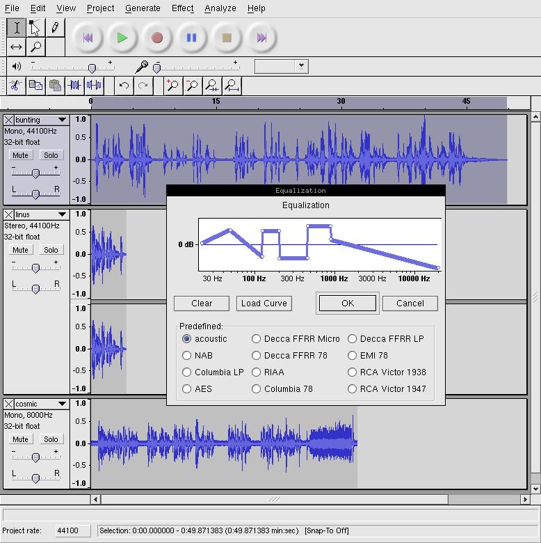 Figure 5 illustrates Audacity with three soundfiles opened—a mono WAV file, a stereo AIFF file and a file in Sun's AU format. Audacity also imports MP3 and Ogg files. It exports Ogg files directly, thanks to the Ogg/Vorbis libraries, but MP3 export depends on a user-supplied encoder. Figure 5 also shows Audacity's native equalizer plugin at work.